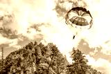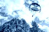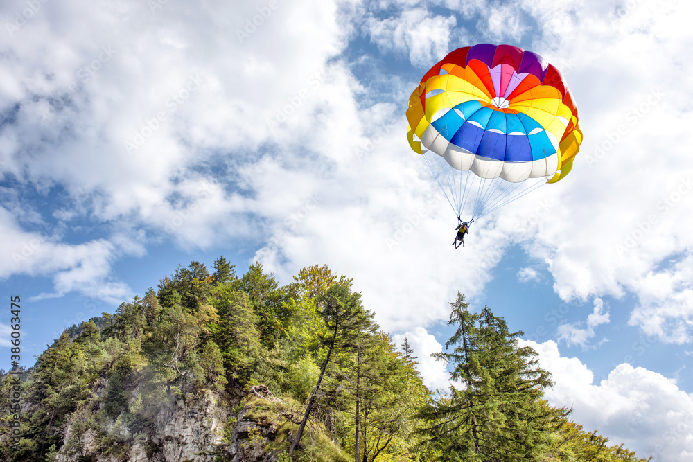 Gliding using a parachute on background of high Alps mountains wth green forest under blue cloudy sky.