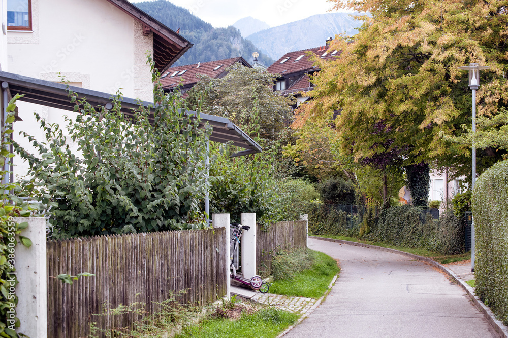 A view of the Alps and an old German city in fall on background of mountains under blue sky.