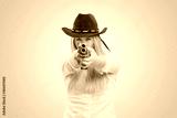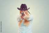 Cowgirl aiming at camera with gun