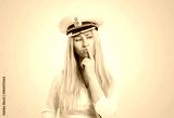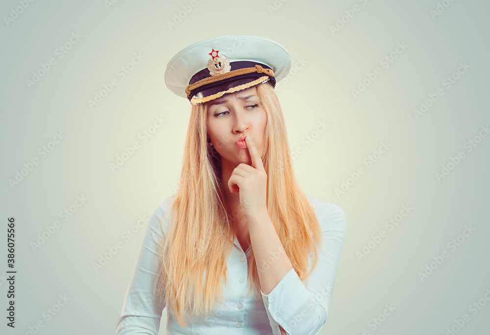 woman in captain hat thinking, looking up to the side expressing doubt and wonder