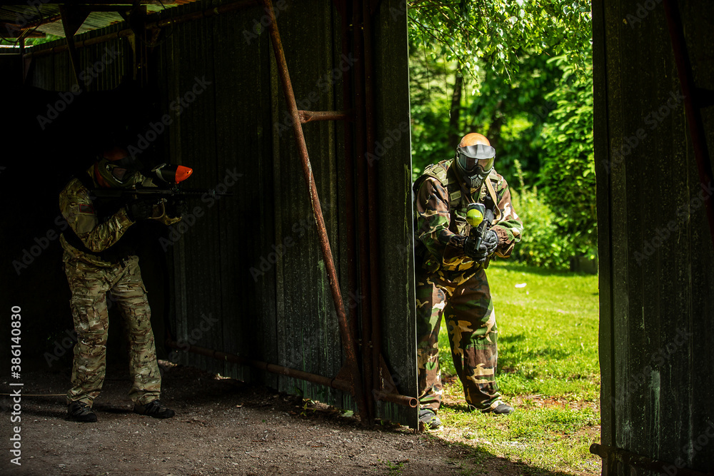 Paintball game, the player sneaks to the door, where the other is waiting for him