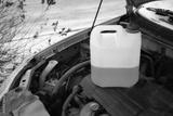 Windscreen washer fluid standing on the engine. Non-Freezing windshield washer. Winter service for safe driving. Service and care, replacement technical fluids according to the season