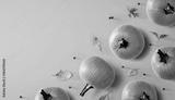 Autumn pumpkins with colorful leaves overhead view - flat lay
