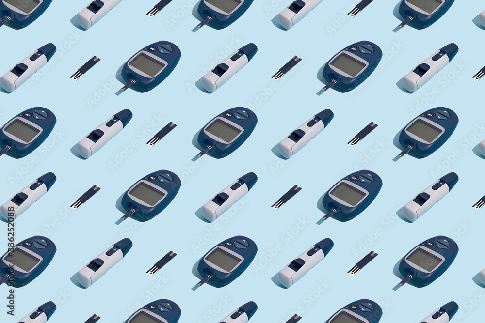 Glucose meter and pen on blue background with shadow, Metabolic syndrome concept