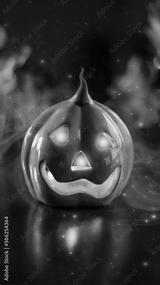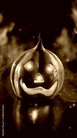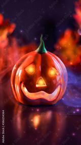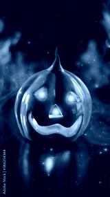 Neon glowing pumpkin head on abstract blurred bokeh background. Festive Halloween background with cobwebs and pumpkin. Blurred background.