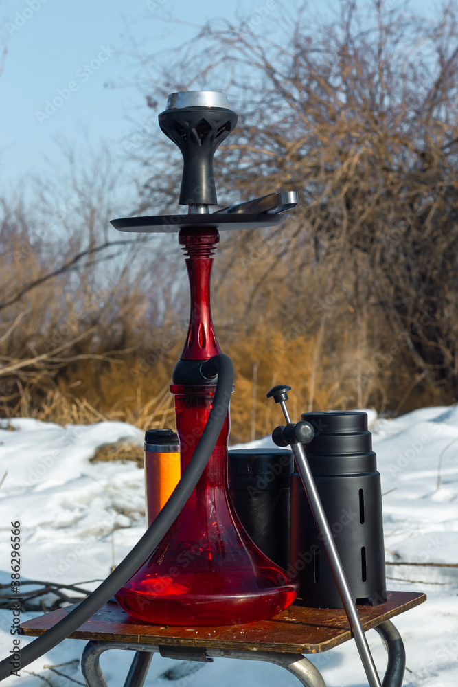 Hookah outdoors for smoking enjoy, arabic water pipe in campside at sunny day, winter camping relax lifestyle