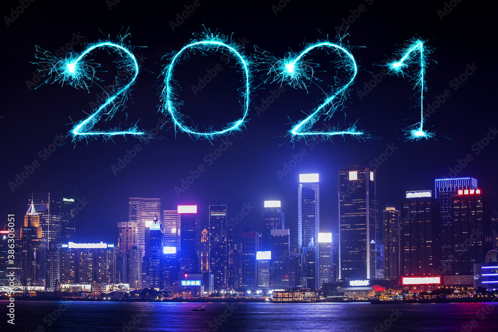 2021 Happy New Year fireworks over Hong Kong cityscape at night