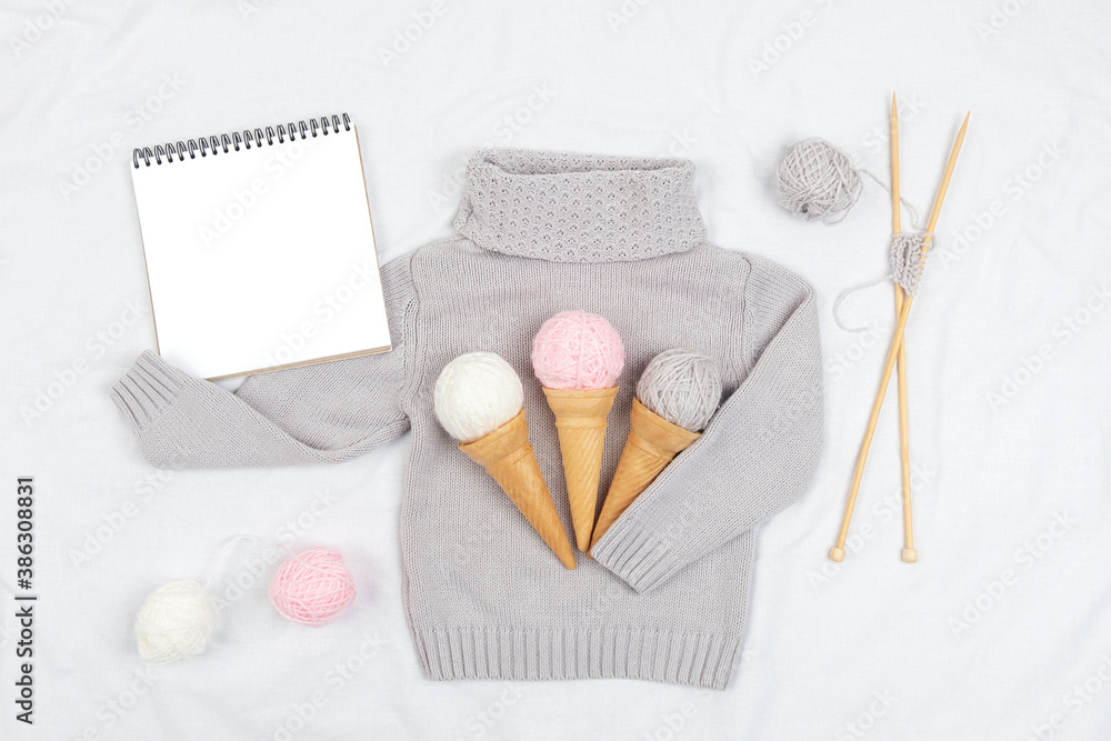 Three ice cream from yarn and waffle cones on a gray knitted sweater, wooden knitting needles and open notepad on white background. Knitting, hobby and DIY concept. Top view Flat lay
