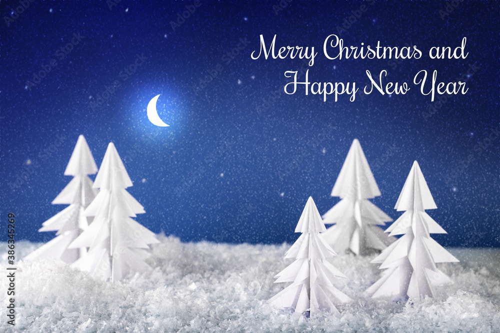 Christmas card. Background Xmas design of night winter landscape with origami christmas trees, artificial snowflakes. Horizontal christmas poster, headers, website. Free font used.