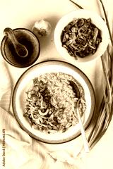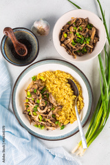 Risotto alla milanese with saffron with pan fried oyster mushrooms, garlic and green onion.