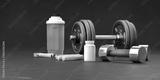 Supplement and gym and fitness workout equipment. Sport lifting bodybuilding concept with vitamins background. Body supplements copy space black template. 3d rendering.
