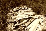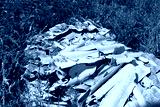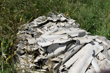 Płytki azbestowe wyrzucone na trawę. Dzikie wysypisko śmieci.