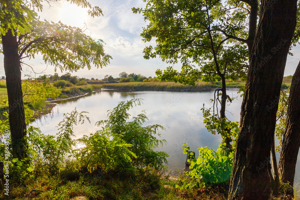 Autumn landscape of beautiful lake and blue sky