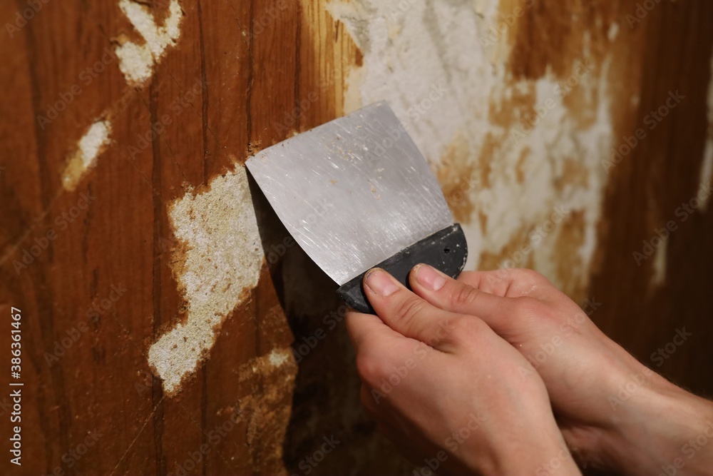 Repair in the apartment tearing off the old wallpaper with a spatula