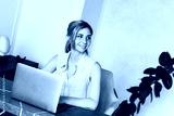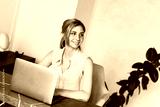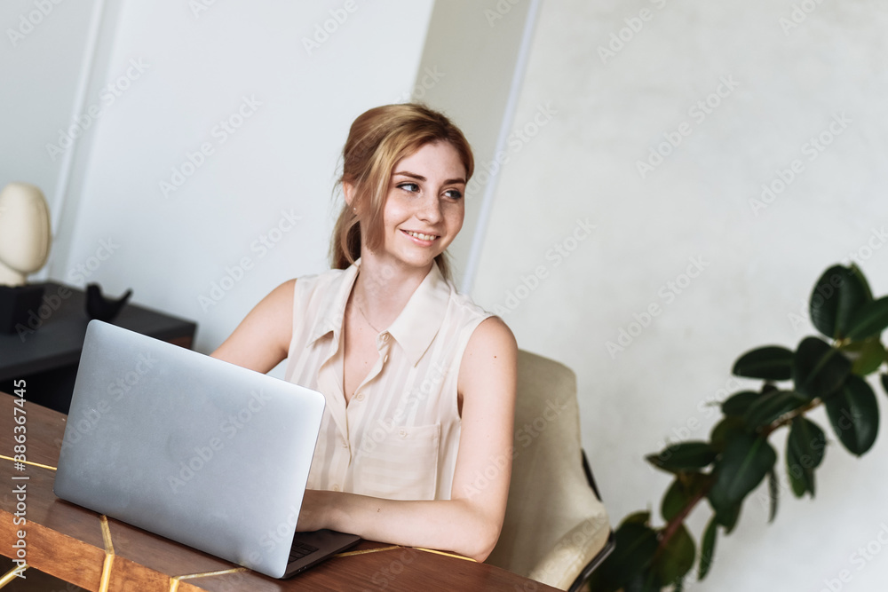 Freelancer, businesswoman working from home sitting at a table in a laptop. A woman works in a bright interior during quarantine due to a coronavirus