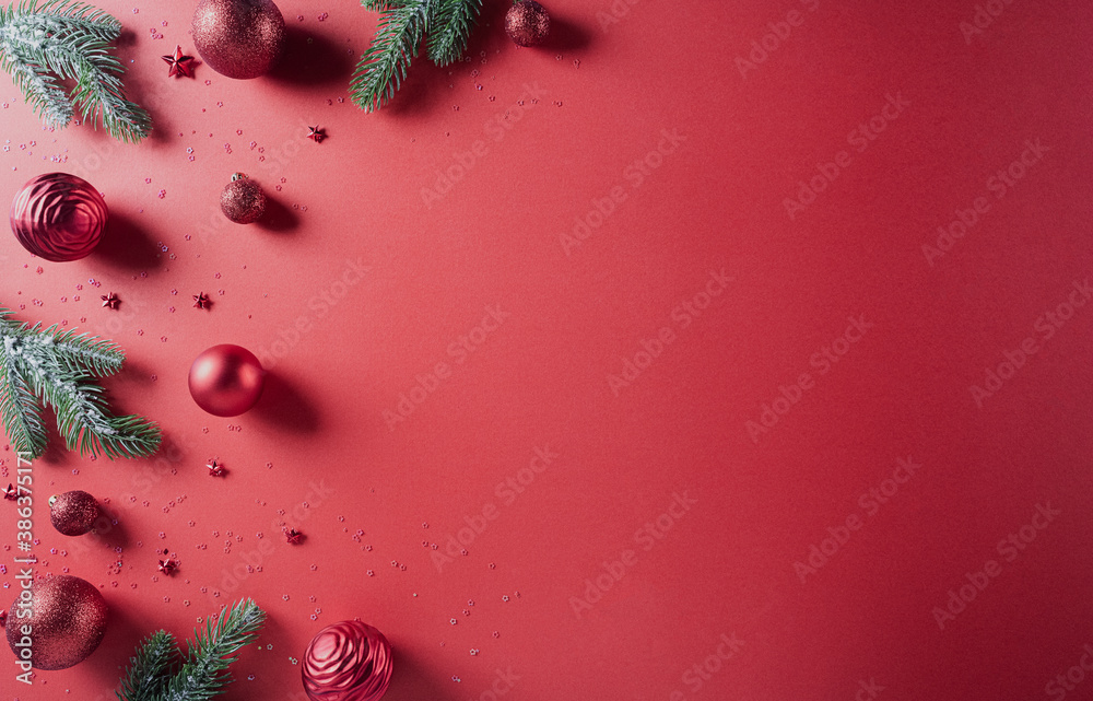 Christmas composition. Fir tree branches, red ball and stars on red background. Christmas, winter, new year concept. Flat lay, top view, copy space for text.