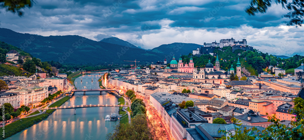 Panoramic summer cityscape of Salzburg, Old City, birthplace of famed composer Mozart. Dramatic outdoor scene of Eastern Alps, Austria, Europe. Captivating evening landscape with Salzach river.