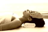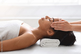 Peaceful african american woman getting healing head massage at spa