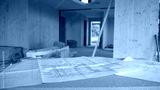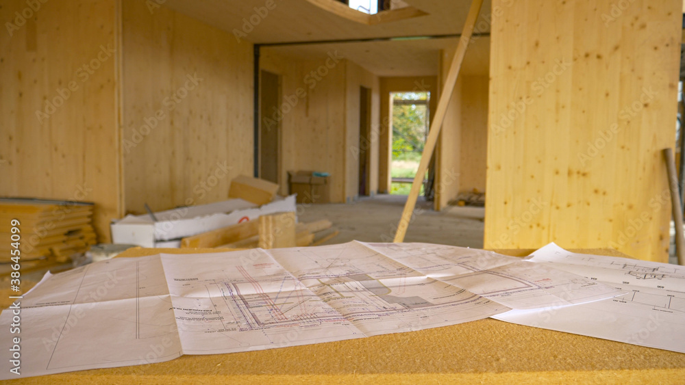 CLOSE UP: Blueprints and other plans lie on a makeshift desk in a CLT house.