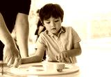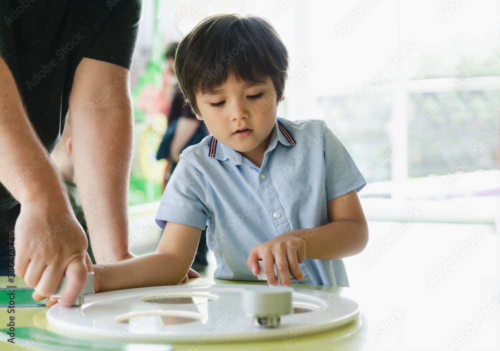 High key portrait kid playing game in playroom with parent, father and Child holding bottom game with wondering face in a sunny summer, Family outing Learn and play, Homeschlooing Education concept