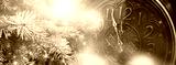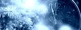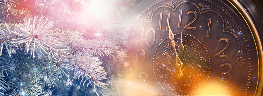New Year banner with clock. Neon lights, holiday lights. Time shows 12 o'clock, New Year and Christmas 2021. Winter holiday background.