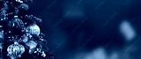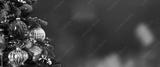 Decorated with ornaments and lights Christmas tree on green background. Merry Christmas and Happy Holidays greeting card, frame, banner. New Year. Noel