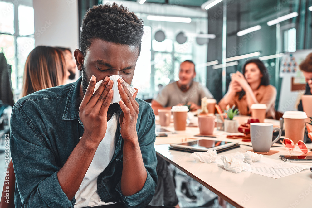 Sick man sneezing in office. Influenza virus