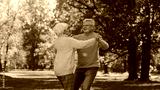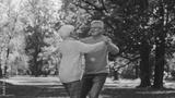 Happy old couple dancing in park. Senior man flirting with elderly woman. Romance at old age autumn day. High quality photo