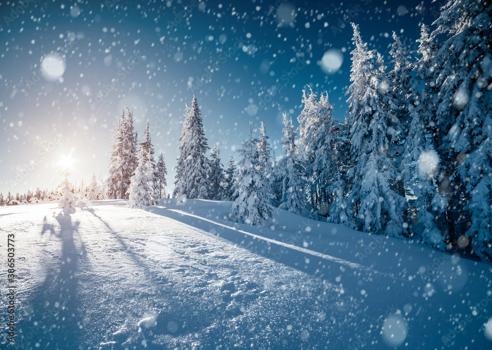 Sunny frosty day in snowy coniferous forest. Christmas holiday concept.