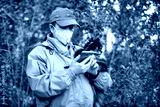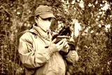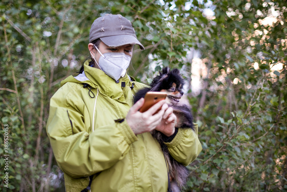 A woman wearing respirator mask and dialing a smartphone walking with a dog in the forest at COVID-19 period.