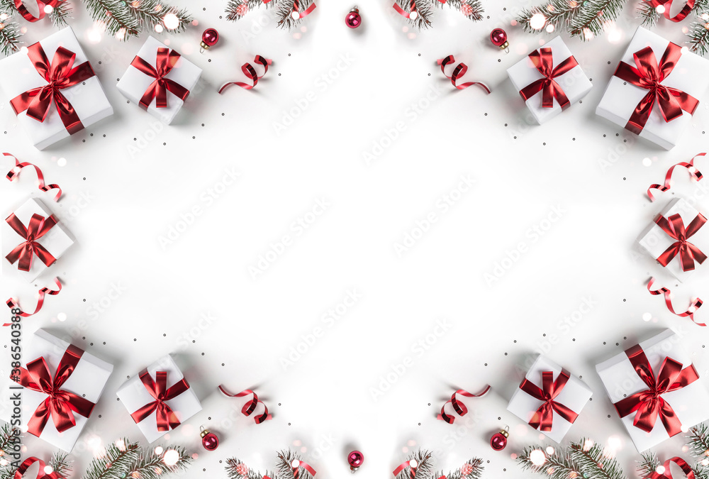 Creative frame made of Christmas fir branches, gift boxes, red decoration, sparkles and confetti on white background. Xmas and New Year holiday, bokeh, light. Flat lay, top view