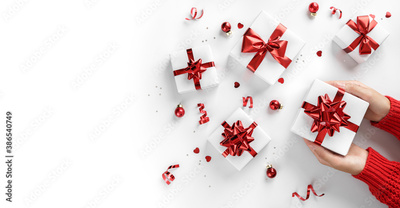 Female hands holding Christmas gift box on white background with fir branches, red decoration, sparkles and confetti. Xmas and New Year greeting card, winter holiday. Flat lay, top view