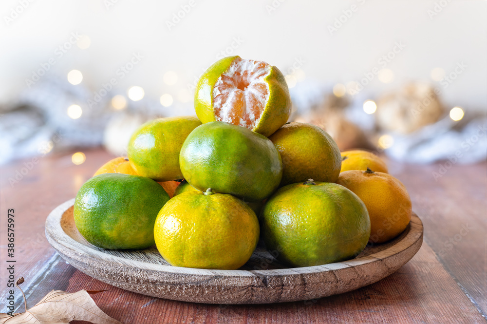 seasonal fresh green tangerines on a wooden plate and rustic bac