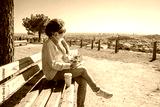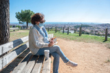 A woman a surgical mask, sitting on a bench writing in her notebook with the city in the background
