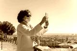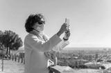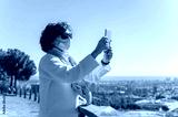 A woman wearing a surgical mask, taking pictures with her smart phone at a mountain viewpoint overlooking the city