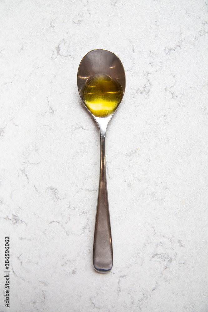 Spoon with an olive oil on a marble background, top view.