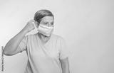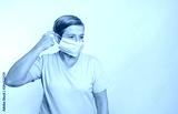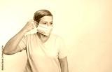 Elderly woman putting on mask to stay safe and prevent spreading of corona virus