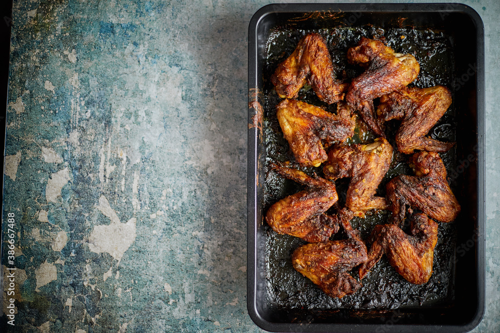 Grilled chicken wings in spices in black metal baking tray on stone table. Top view