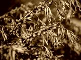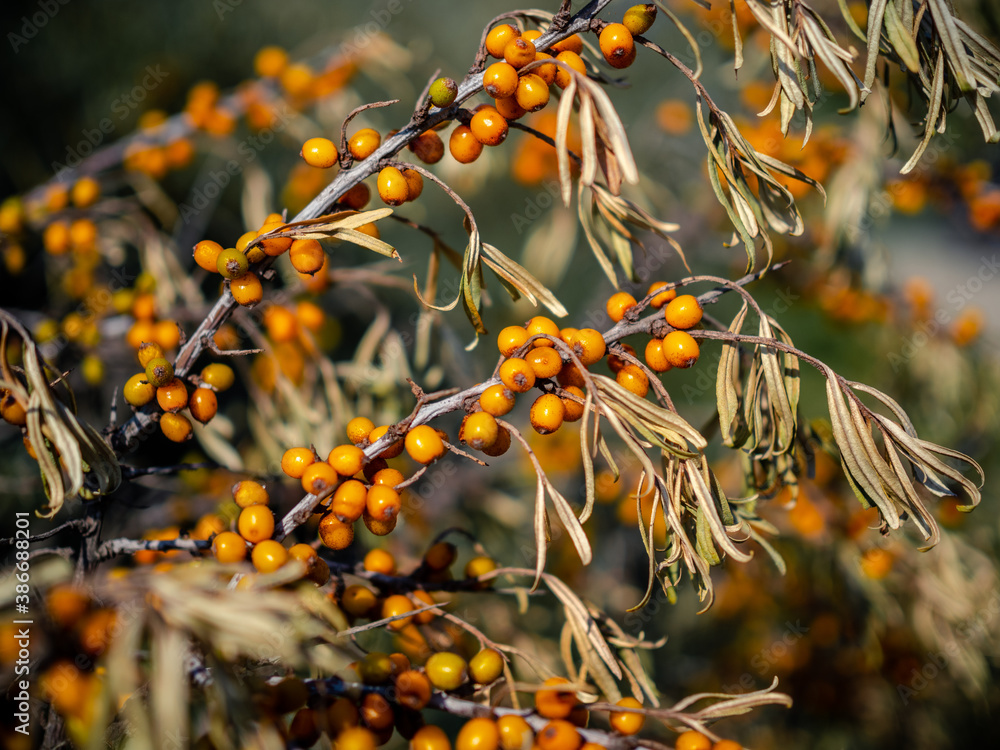 Closeup photo of sea buckthorn bushes with yellow ripe sour berries. Wild & organic sandthorn. Natural botanic background. Healthful & tasty berry is used in medicine and culinary art as an ingridient