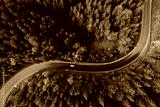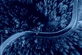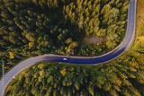 Aerial top view of curvy mountain road goingthroughthe pine forest.