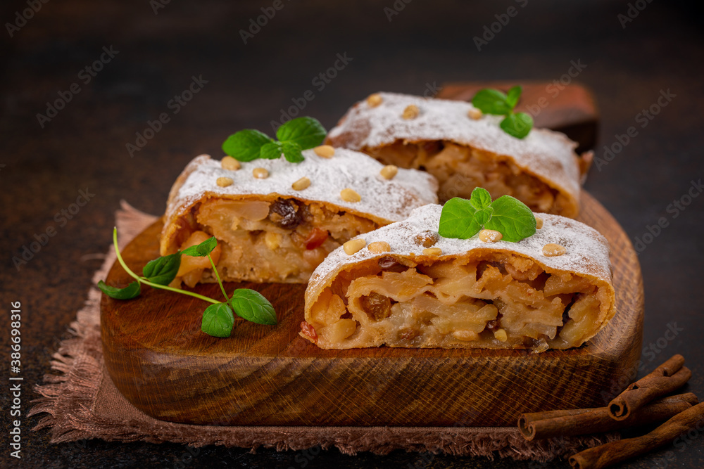 Homemade apple strudel, filled with apples, raisins, cinnamon and pine nuts. Traditional South Tirol recipe.