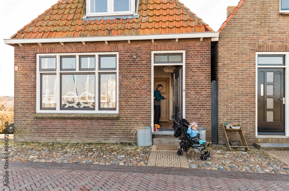 Baby stroller in front of old house