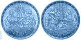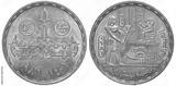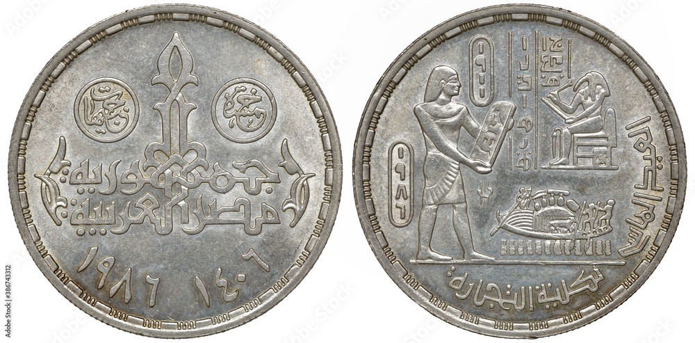 Egypt, Egyptian silver coin 5 five pounds 1986, subject Faculty of Commerce – Cairo University, country name and value in Arabic, Egyptian with tablet, God Thoth top right, loaded boat bottom right,