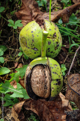 Two walnuts inside a cracked green walnut shell on the ground. Vertical shot.