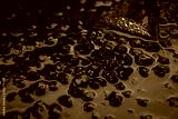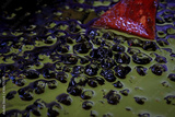 Chokeberry berries on the surface in chokeberry jam with a wooden cooking spoon.