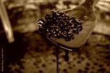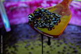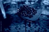 Chokeberry berries on a wooden spoon for cooking chokeberry jam.