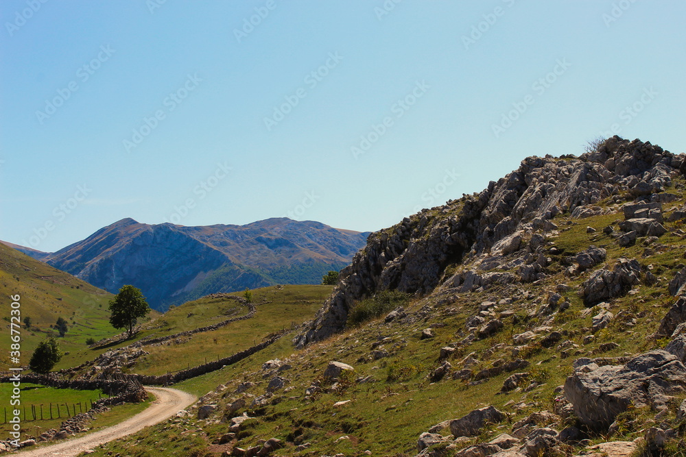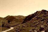 Beautiful mountain landscape in autumn. Rocky area with a couple of trees and a mountain road. Mountain peaks in the background.