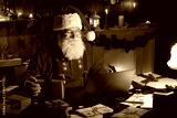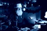 Happy old Santa Claus wearing hat holding gift box using laptop computer sitting at workshop home table late on Merry Christmas eve. Ecommerce website xmas time holiday online shopping e commerce sale