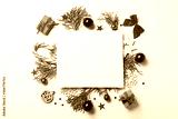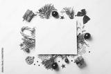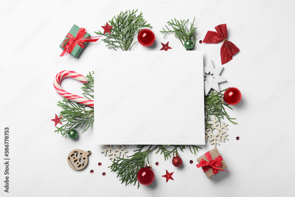 Flat lay composition with Christmas decor and blank card on white background. Space for text