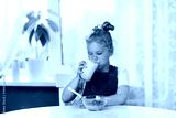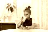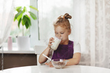 Cute little girl eats cereal with milk for Breakfast. The girl drinks milk from a glass glass. Healthy Breakfast, taking care of children. Space for text